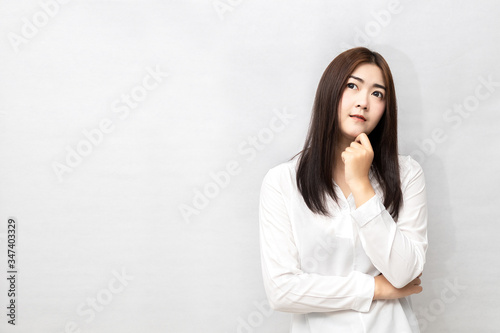 Long-haired Asian women are standing thinking isolated on white background.