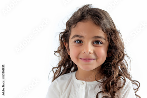 Lovely Arabian preschool-aged girl with a kind smile, looking at the camera, isolated on white background.