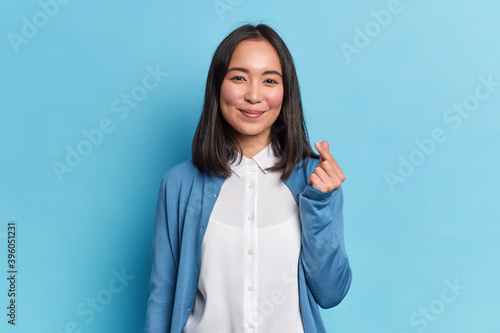 Lovely brunette Asian woman with rouge cheeks show mini heart gesture makes korean like sign wears white shirt and blue jumper expresses love has gentle smile poses indoor. Body language concept