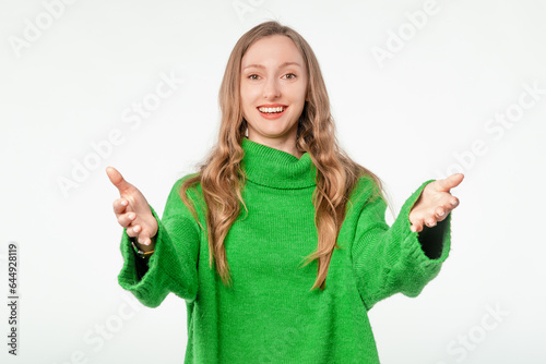 Lovely, friendly woman spreads her arms for hug, cuddle, stands with open hands and smiles happily, white studio background