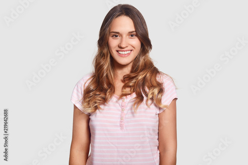 Lovely merry beautiful young Caucasian female in casual pyjamas, being in good mood ater good sleep, isolated over white background, shows perfect teeth, healthy skin, enjoys domestic atmopshere