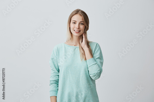 Lovely young woman with long silky blonde hair and dark eyes having perfect teeth smiling with pleasure while looking at camera isolated against gray background. Pleasant emotions and feelings