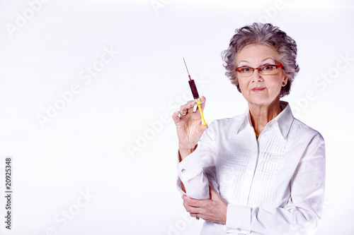 Ältere Ärztin hält Spritze mit Blut Porträt