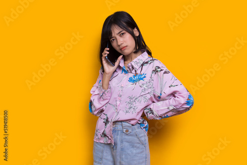 mad and shock young asian beautiful woman using mobile phone isolated on yellow background