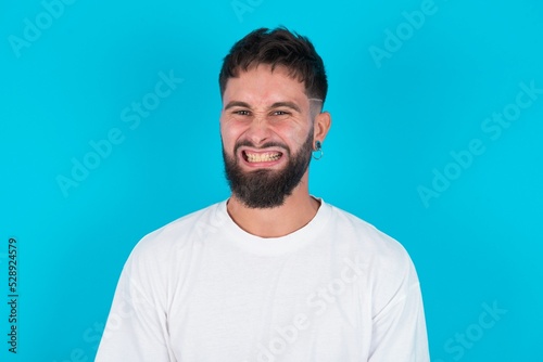 Mad crazy bearded caucasian man wearing white T-shirt over blue background clenches teeth angrily, being annoyed with coming noise. Negative feeling concept.