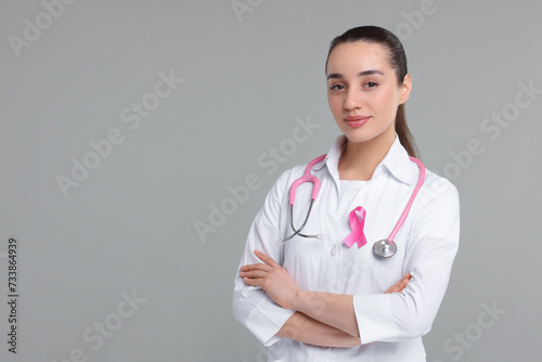 Mammologist with pink ribbon on gray background, space for text. Breast cancer awareness
