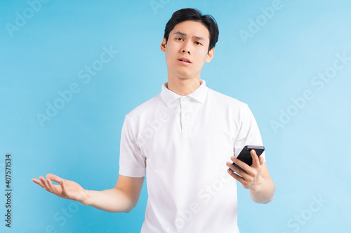 Man frowns look at camera holding smart phone having problems with wi-fi no wireless connection, need repair broken phone, unpleasant message received concept
