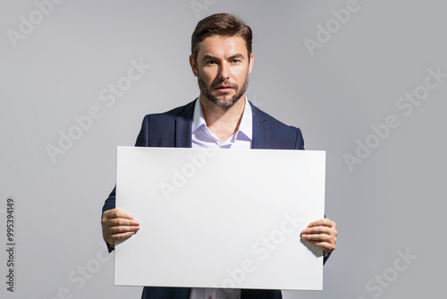Man holds the sign, blank card. Placard ready for your product. Sign to your text. Man showing blank sign board on studio isolated background. Empty blank board. Area for advertising, copy space.