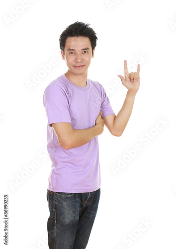 man in t-shirt with hand sign I love you