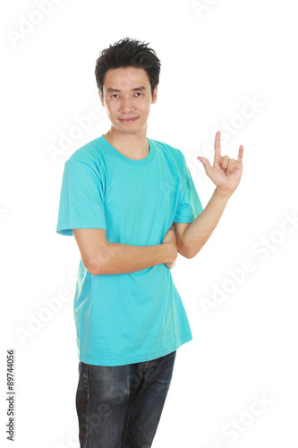 man in t-shirt with hand sign I love you