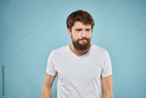 Man in white t-shirt emotions facial expression cropped view studio blue background lifestyle