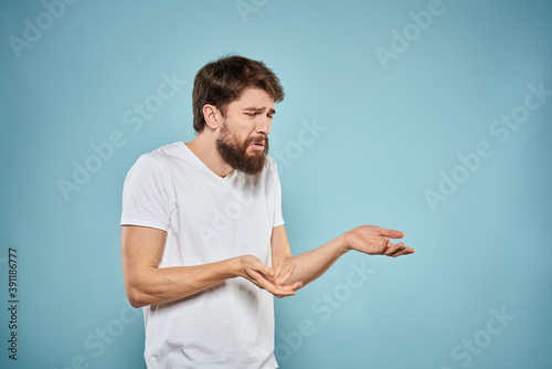 Man in white t-shirt emotions facial expression cropped view studio blue background lifestyle