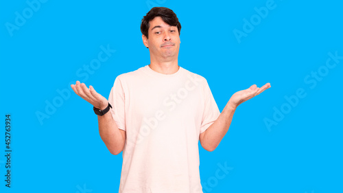 Man looks like he's in doubt with his hands open and in a light shirt.