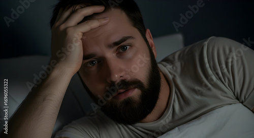 Man lying in bed awake at night suffering from insomnia sleeplessness stressed worried tired adult male person dark room sleepless night adult man