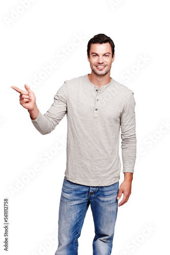 Man, studio and portrait while pointing finger at space for advertising isolated on a white background. Happy male model from France with hand sign for promotion, announcement and brand product