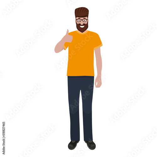 Man with a beard shows a thumb up like sign. Cartoon vector illustration, flat design