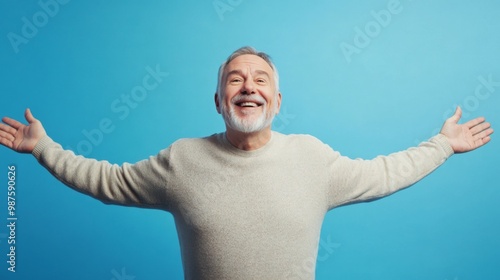Mature Caucasian man with open arms isolated on blue background , studio shot of an handsome white European old retired guy with happy smiling face welcome with open arms on soft color backdrop