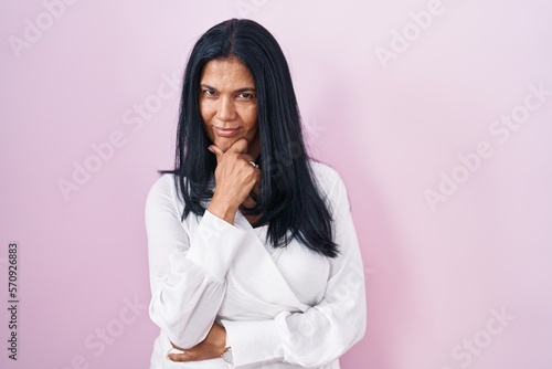 Mature hispanic woman standing over pink background looking confident at the camera smiling with crossed arms and hand raised on chin. thinking positive.