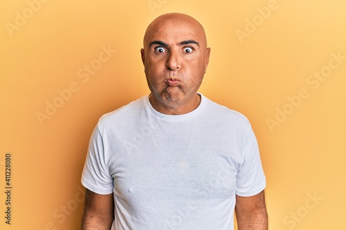 Mature middle east man wearing casual white tshirt puffing cheeks with funny face. mouth inflated with air, crazy expression.