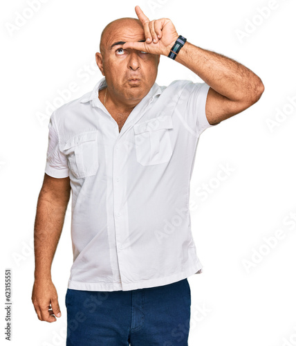 Mature middle east man with mustache wearing casual white shirt making fun of people with fingers on forehead doing loser gesture mocking and insulting.