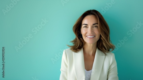 Mature woman in a white suit against a solid turquoise background