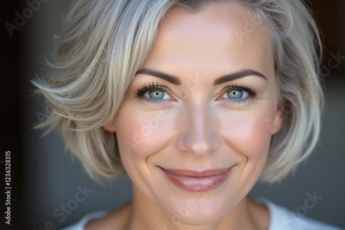 mature, woman, silver, gray, hair, blue, eyes, smiling, serene