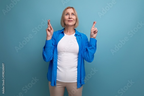 mature woman with blond hair in casual shirt crossed fingers and thinks on blue background with copy space