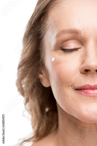 mature woman with cosmetic cream on face and eyes closed Isolated On White