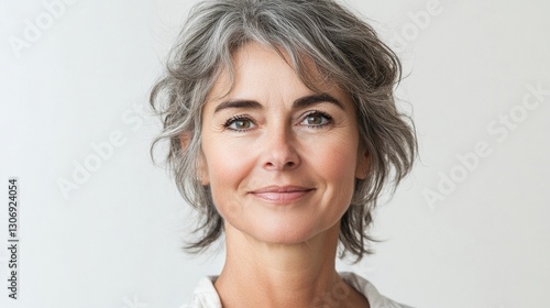 Mature woman with gray hair smiles warmly indoors