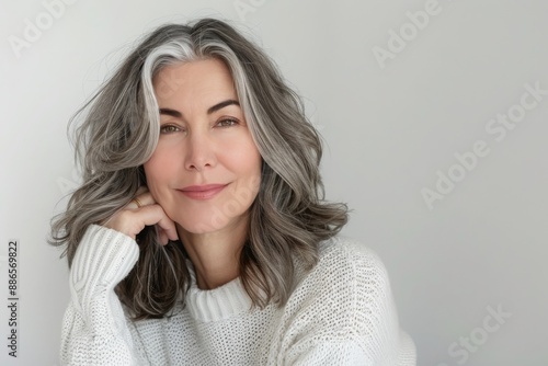 Mature woman with grey hair smiling at the camera in a white sweater