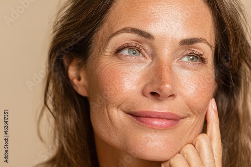 Mature woman with natural skin and fair hair smiles softly looking up. Use this image to promote skincare products or a positive body image.