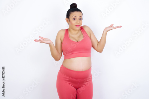 Maybe yes or no. Doubtful young beautiful pregnant woman in sports clothes against white shrugs shoulders in bewilderment, tries to make decision puzzled what he wants. Hesitation and uncertainty.