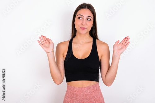 Maybe yes or no. Doubtful young woman wearing sportswear over white studio background shrugs shoulders in bewilderment, tries to make decision puzzled what he wants. Hesitation and uncertainty.