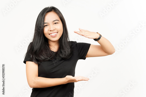 Measuring and Showing Big Sign Product of Beautiful Asian Woman Isolated On White Background
