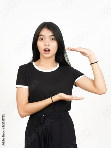 Measuring and Showing Big Sign Product Of Beautiful Asian Woman Isolated On White Background