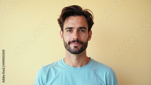 Mediapipe. Man in isolation. Male man model isolated background. Lone man in blue shirt and beard sits alone, symbolizing isolation in everyday life struggles.