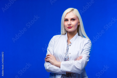 Medical concept of beautiful female doctor in white coat with phonendoscope. Medical student general practitioner. Woman hospital worker looking at camera and smiling, studio, Blue background