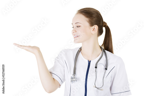 Medical doctor woman presenting and showing copy space