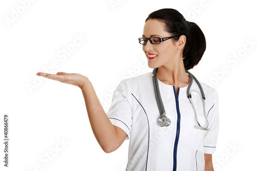 Medical doctor woman presenting and showing copy space for produ
