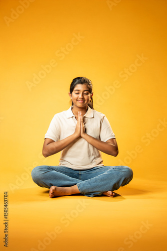 Meditating schoolgirl shows mudra pose with folded legs and eyes closed for inner peace