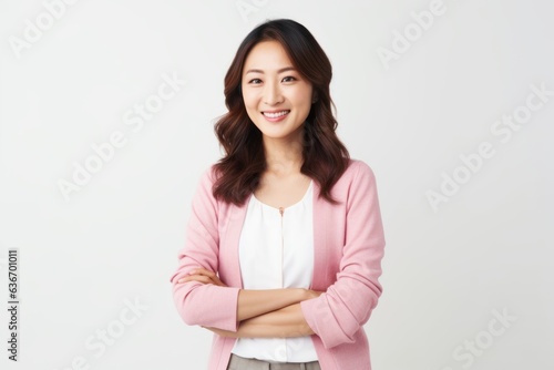 Medium shot portrait of a Chinese woman in her 30s in a white background wearing a chic cardigan