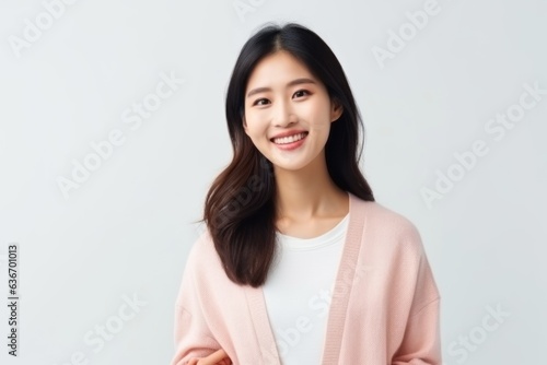 Medium shot portrait of a Chinese woman in her 30s in a white background wearing a chic cardigan