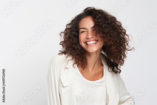 medium shot portrait of a happy Mexican woman in her 30s wearing a chic cardigan against a white background