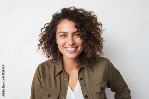 medium shot portrait of a Israeli woman in her 30s wearing a chic cardigan against a white background