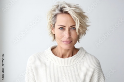 medium shot portrait of a Polish woman in her 40s wearing a cozy sweater against a white background