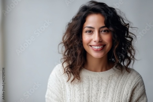 Medium shot portrait of an Indian woman in her 30s in a minimalist background
