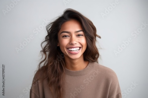 Medium shot portrait of an Indian woman in her 30s in a minimalist background