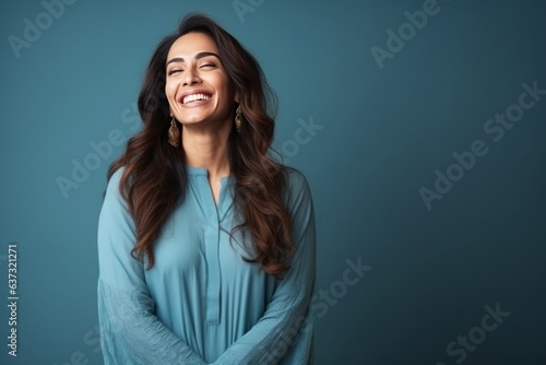 Medium shot portrait of an Indian woman in her 30s wearing salwar kameez in a minimalist background