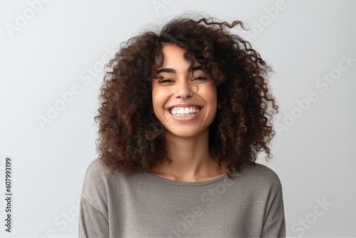 Medium shot portrait photography of a satisfied woman in her 30s that is placed against a white background . Generative AI