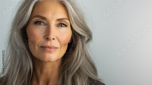 Medium shot studio portrait of a gorgeous 45-year-old woman with shoulder-length grey hair and wrinkles, set against a light grey background. Elegant and natural beauty.
